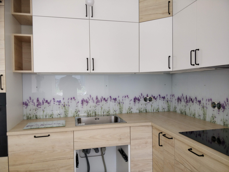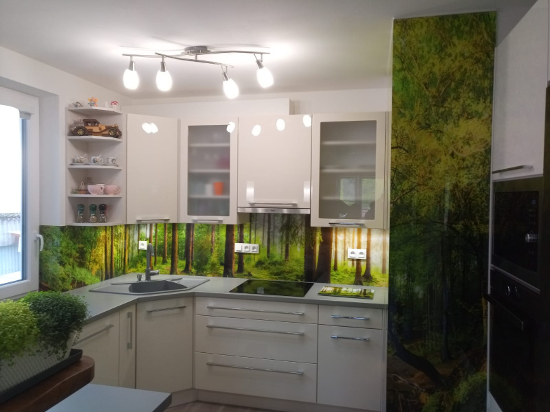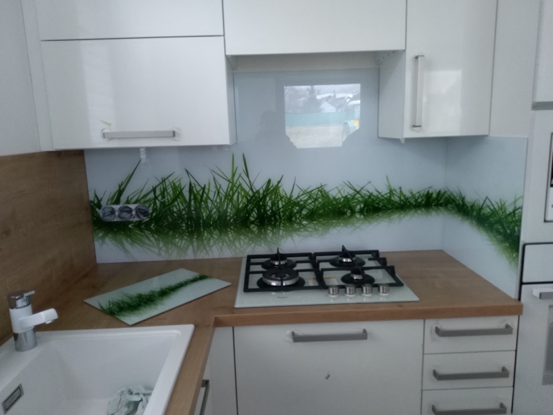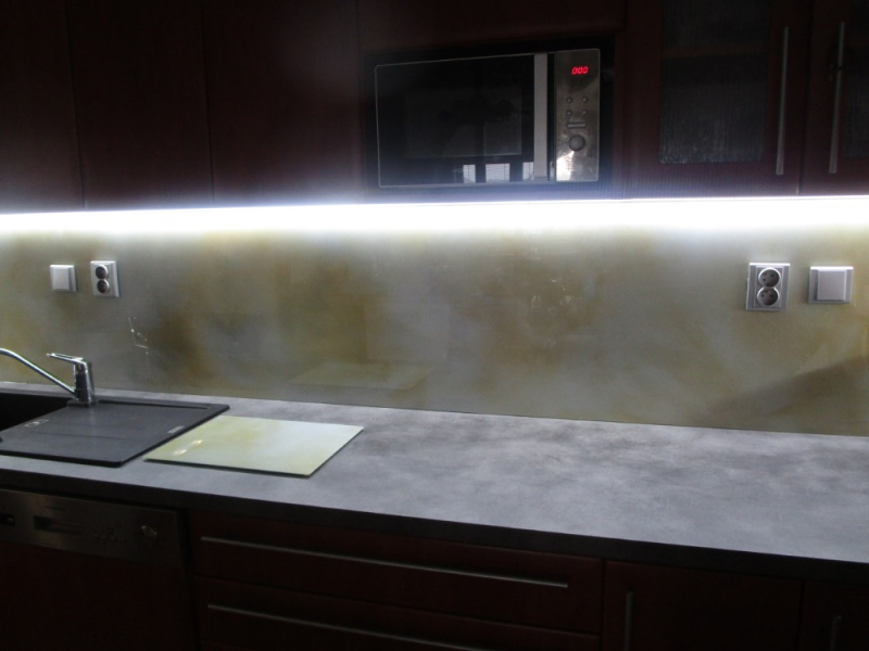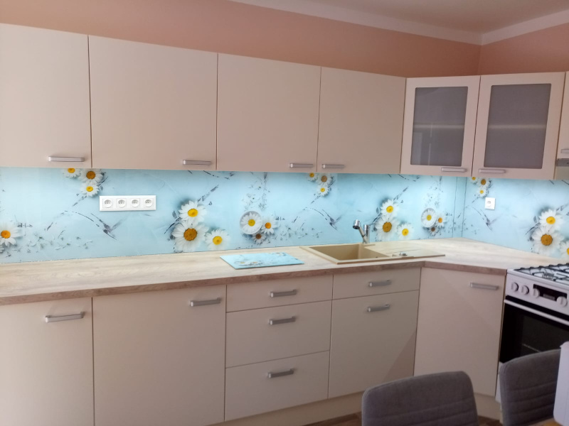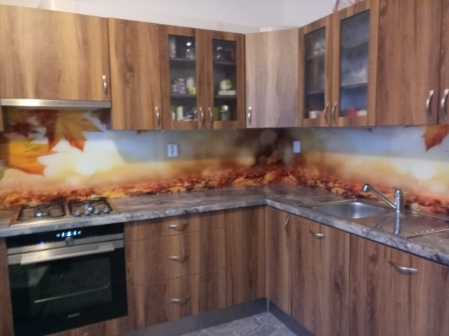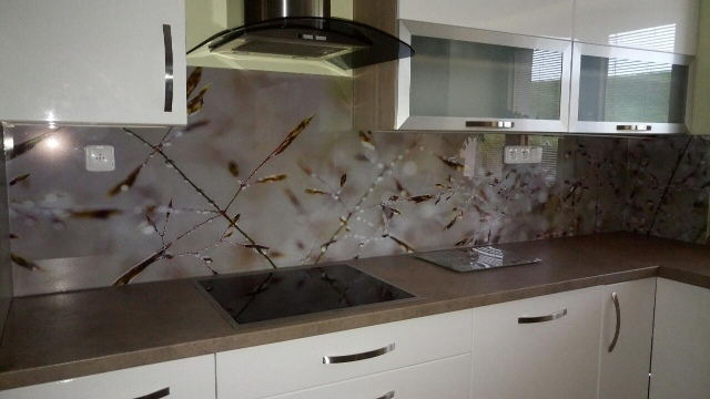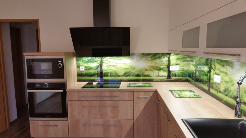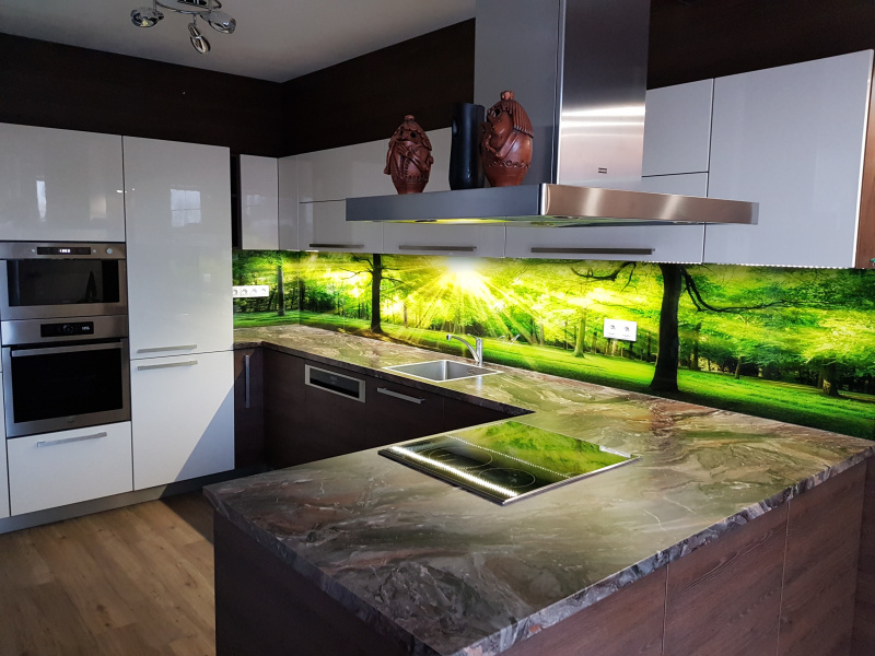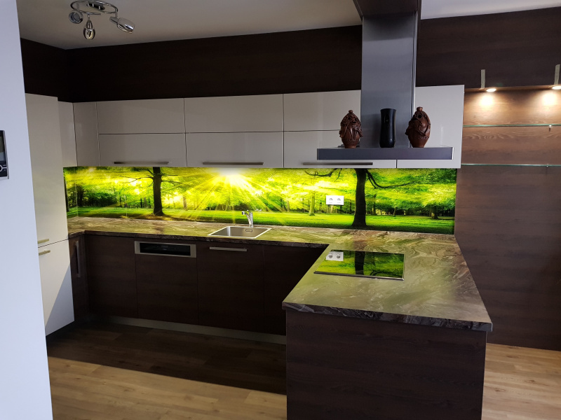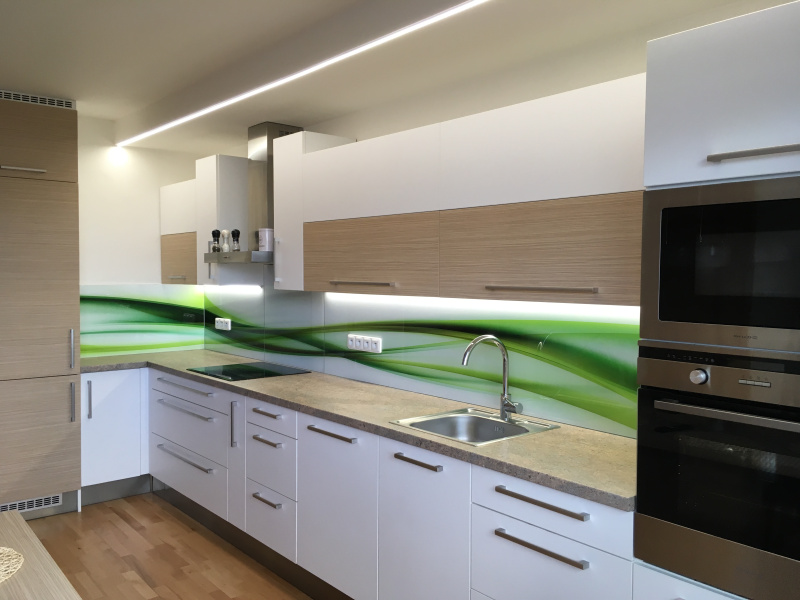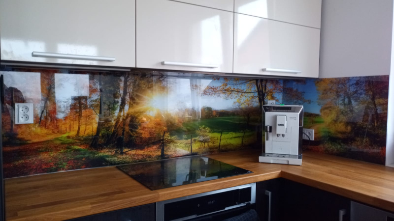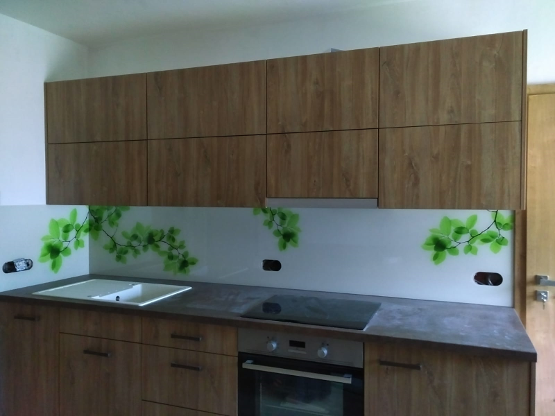 kuchyňské linky se skleněným obkladem různých barev i grafických motivů