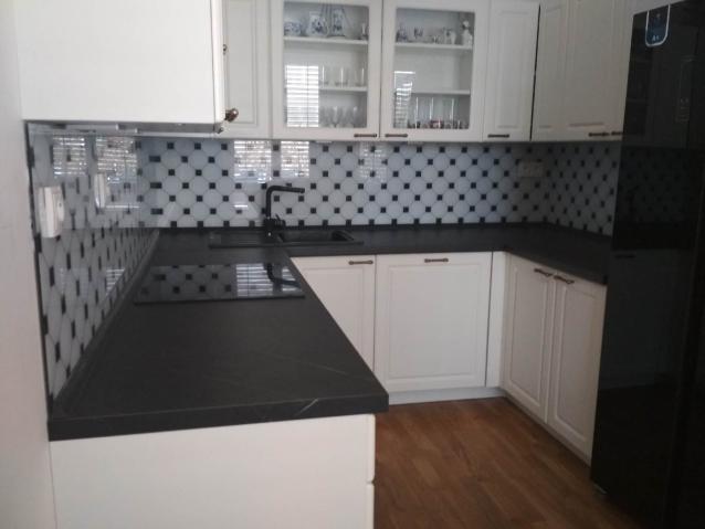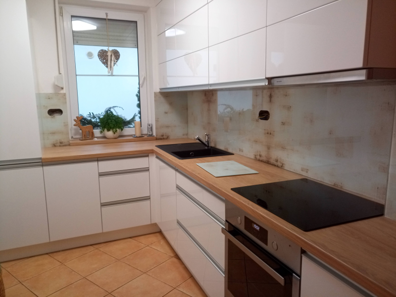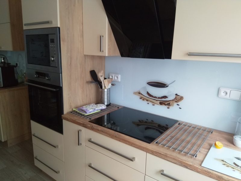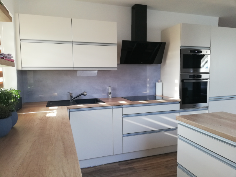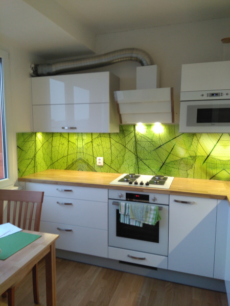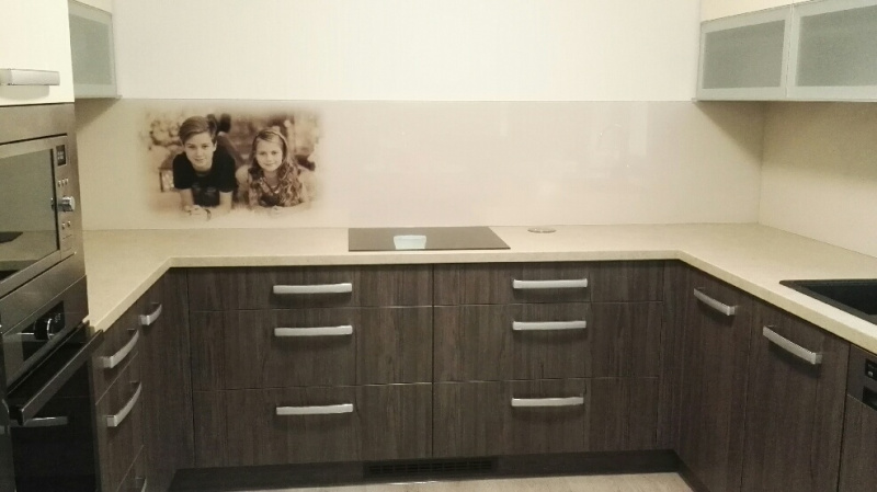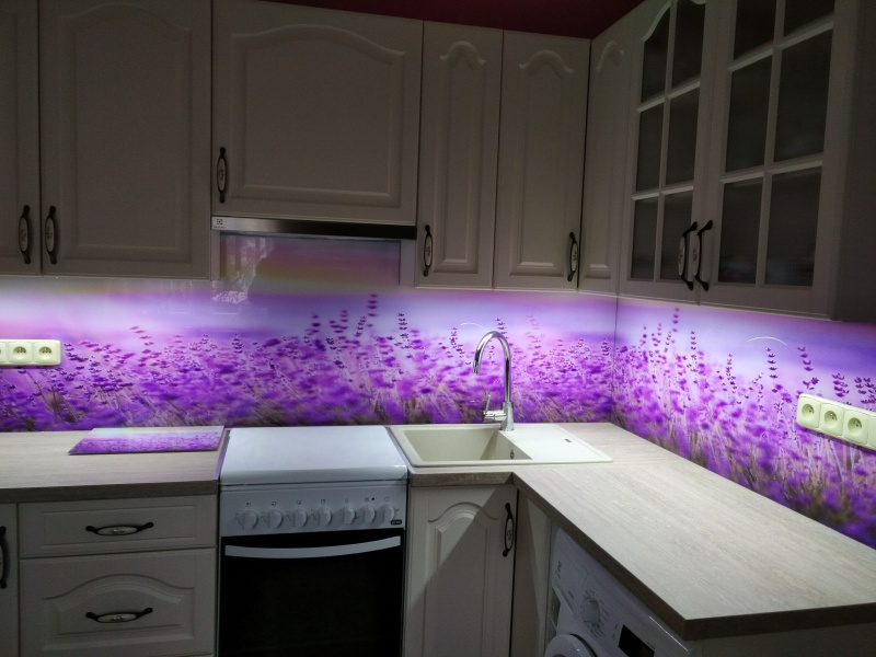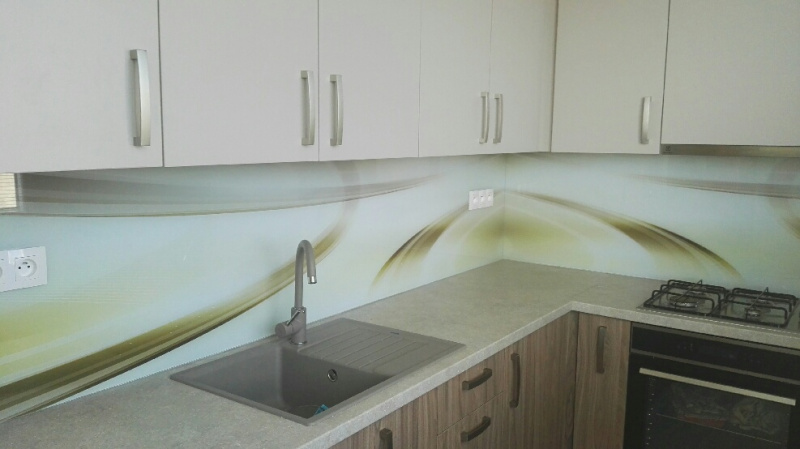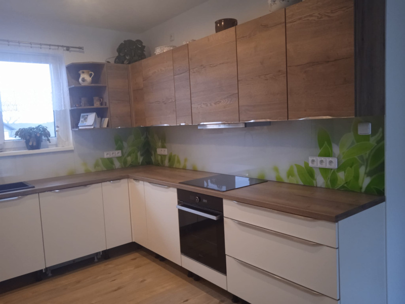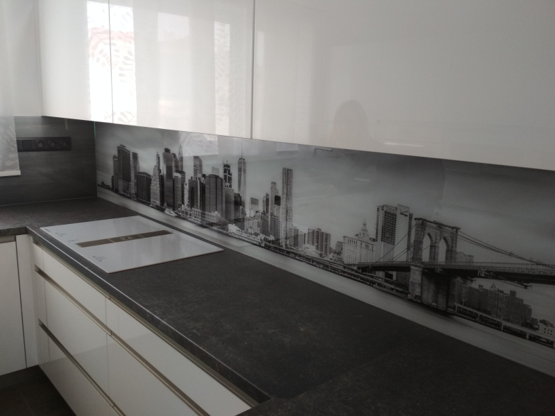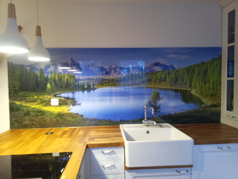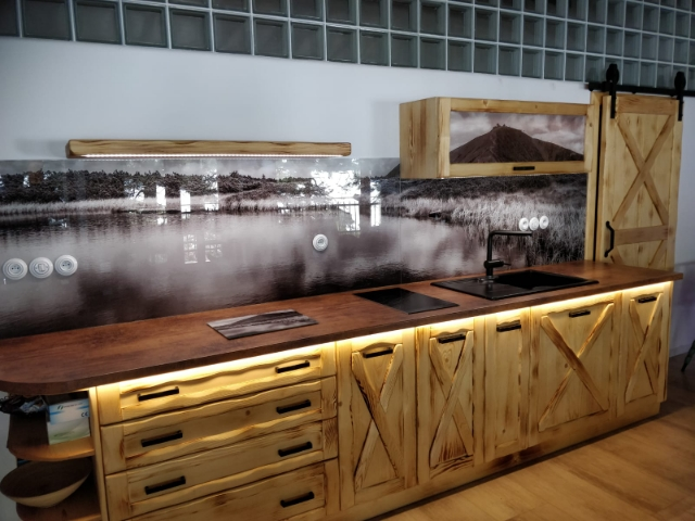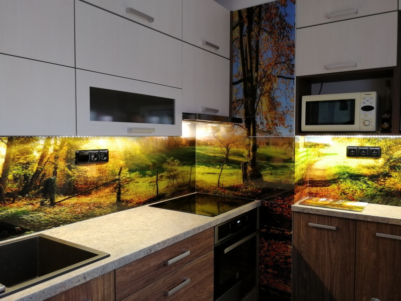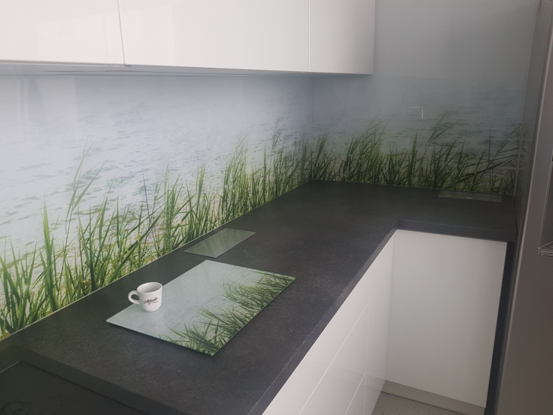 kuchyňské linky se skleněným obkladem různých barev i grafických motivů