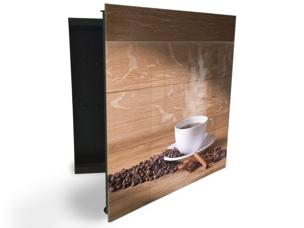 Glasdekor skříňka na klíče - bílý hrnek, káva a koření na dřevě