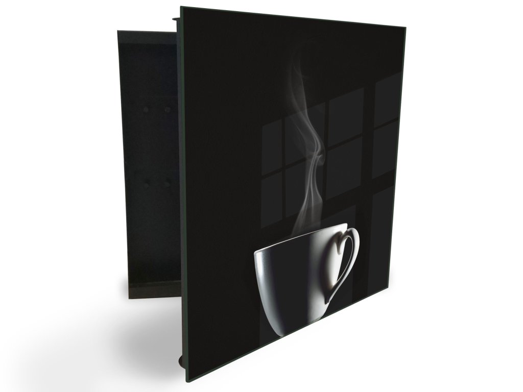 Glasdekor skříňka na klíče - bílý hrnek a kouř na černém pozadí