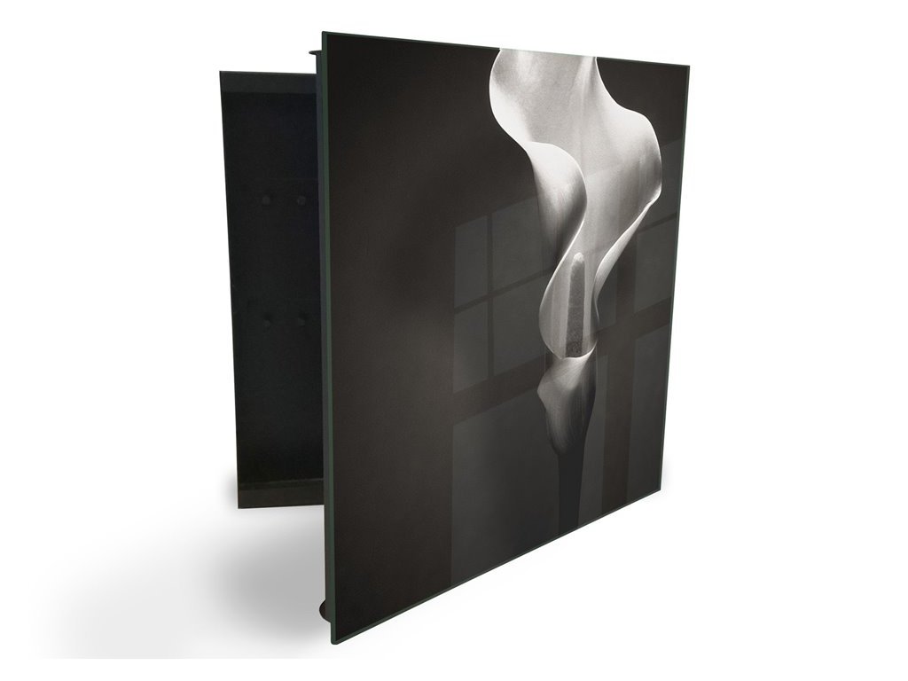 Glasdekor skříňka na klíče - bílý květ kaly na černém