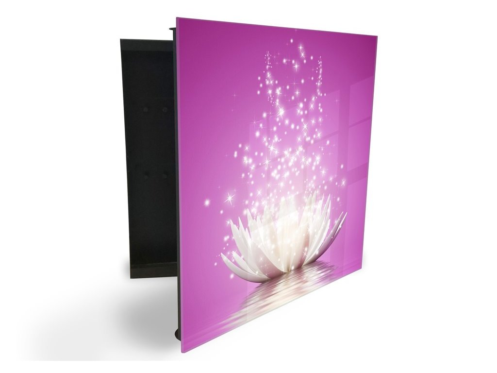 Glasdekor skříňka na klíče - bílý leknín se třpytky, růžové pozadí