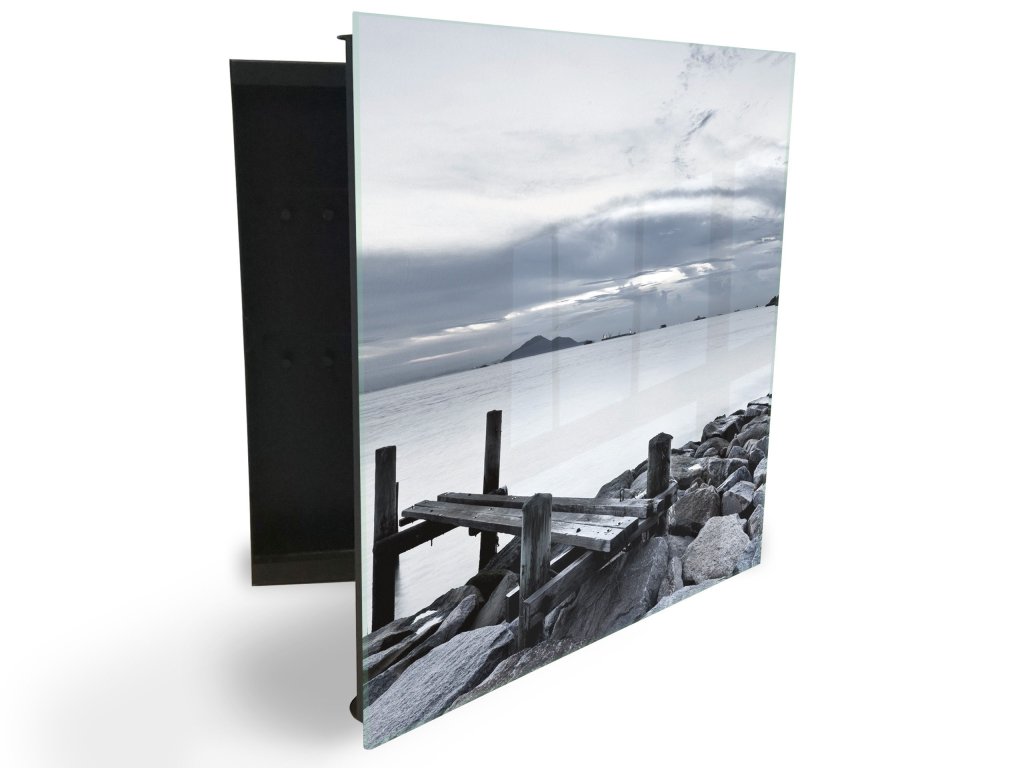 Glasdekor skříňka na klíče - černo bílá lávka u jezera