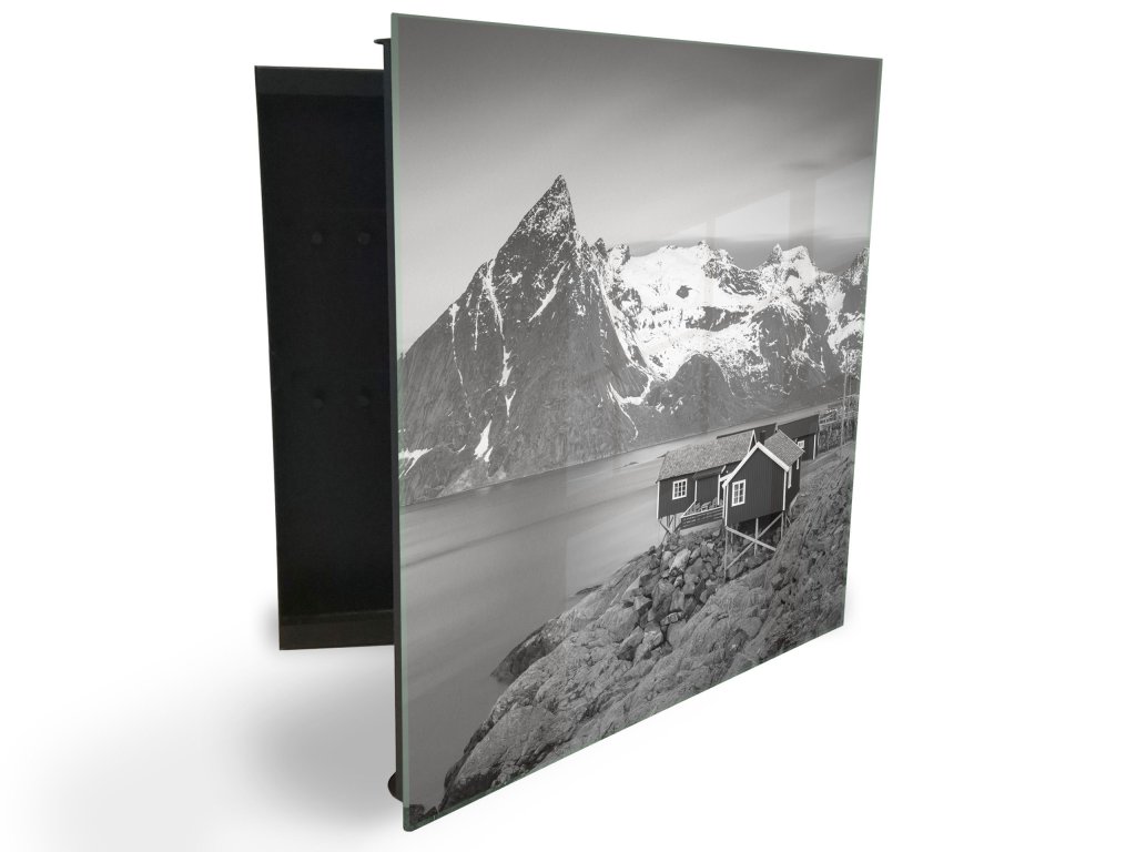 Glasdekor skříňka na klíče -černo bílé hory, jezero, chata