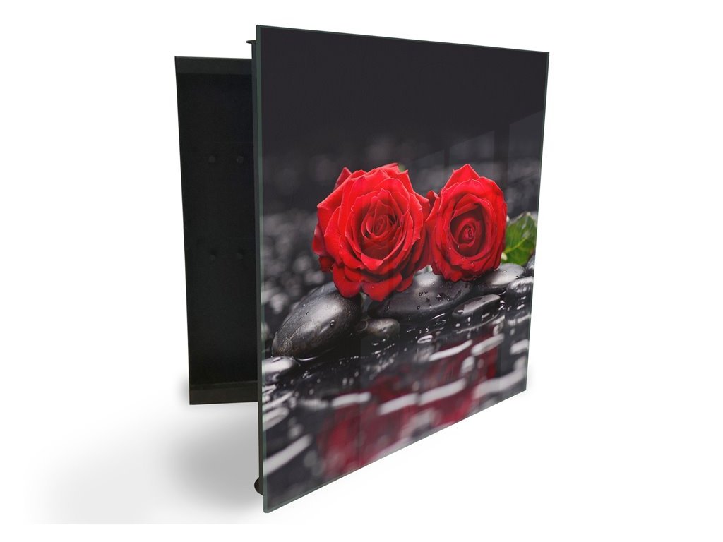 Glasdekor skříňka na klíče - červený květ růže na černém kameni