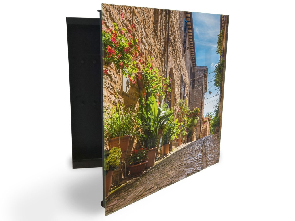 Glasdekor skříňka na klíče - dlažděná ulička ozdobená květinami