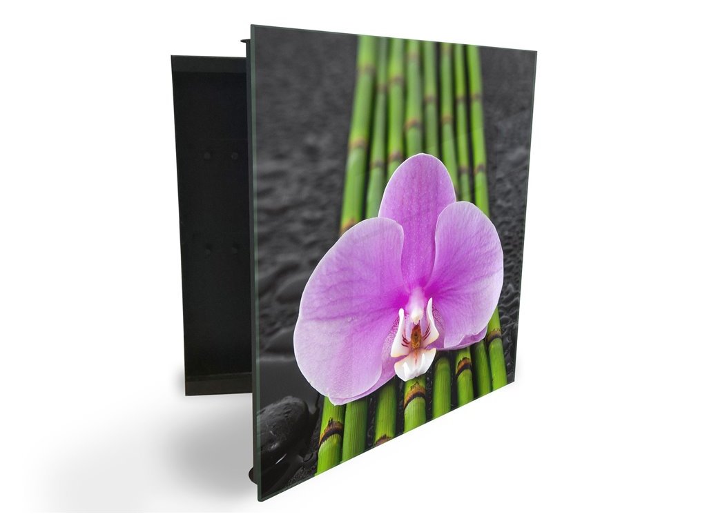 Glasdekor skříňka na klíče - fialová orchidej na bambusu