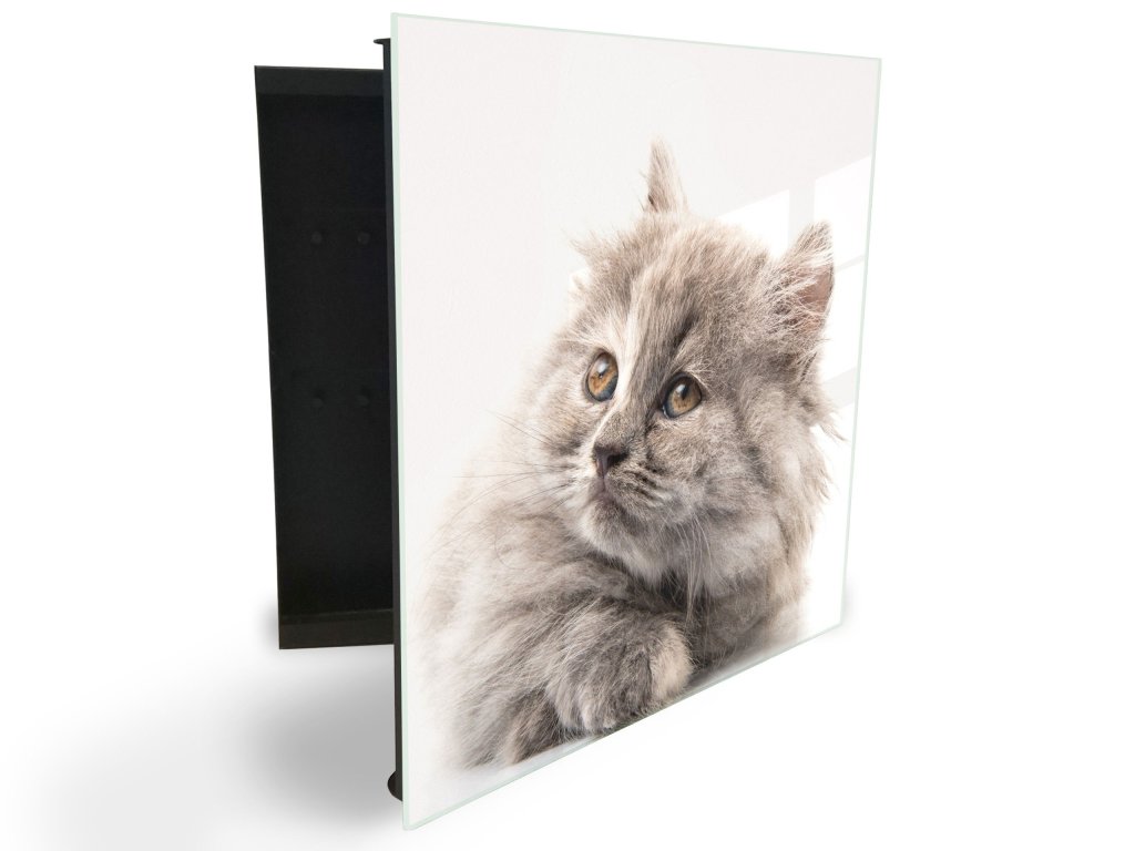 Glasdekor skříňka na klíče - hezká šedá kočka