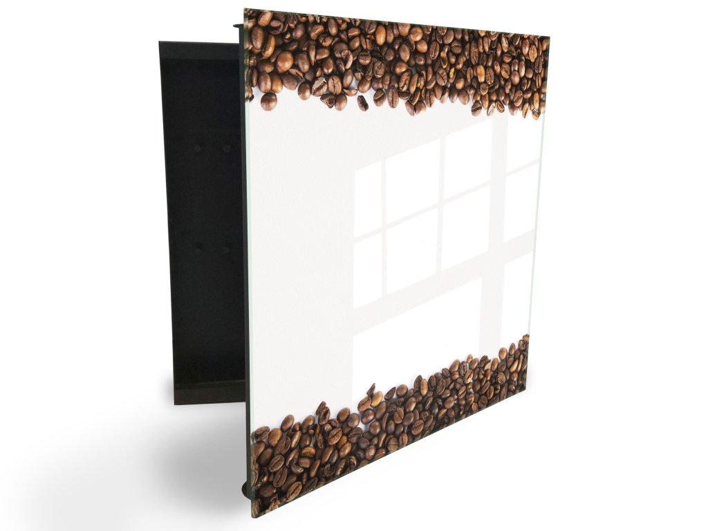 Glasdekor skříňka na klíče - horní a dolní řada kávové zrna na bílém