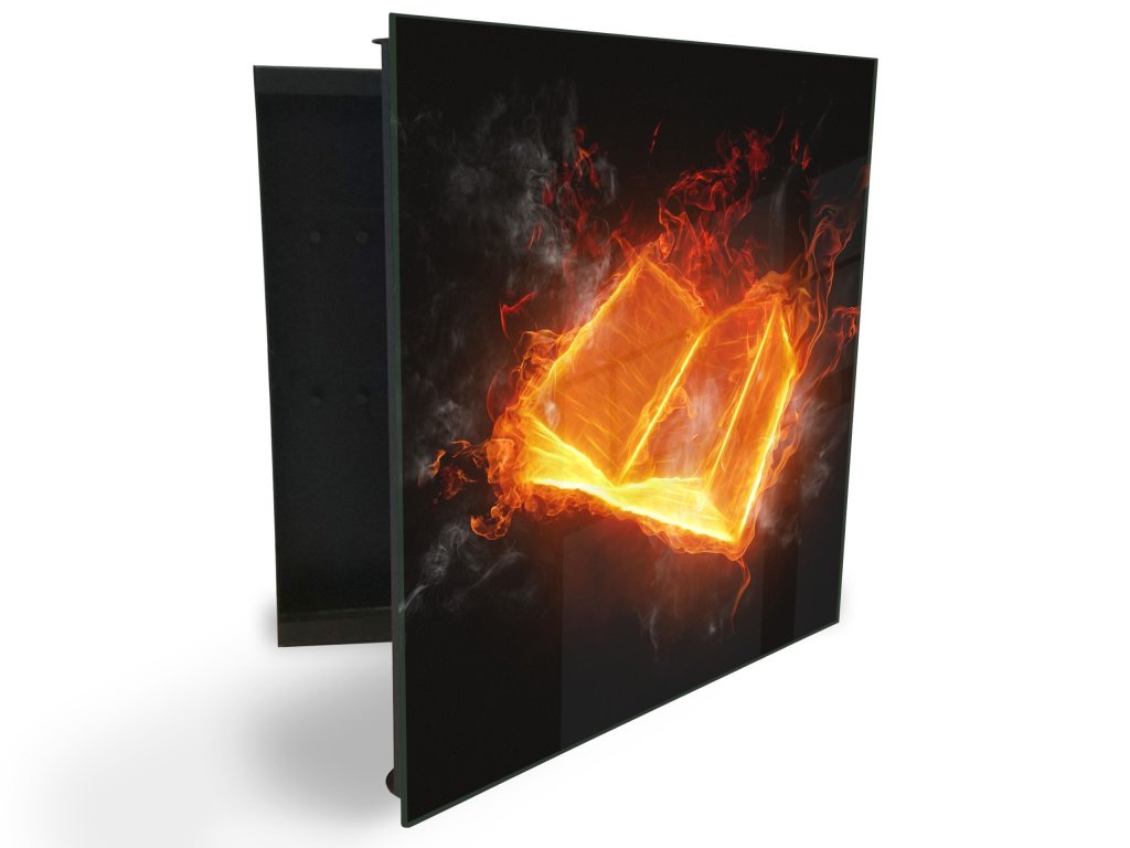 Glasdekor skříňka na klíče - kniha hoří na černém pozadí