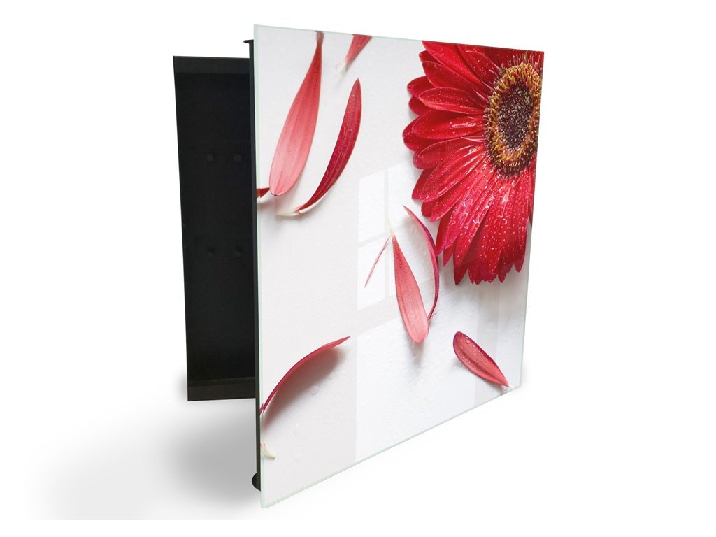 Glasdekor skříňka na klíče - květ červené gerbery na bílém
