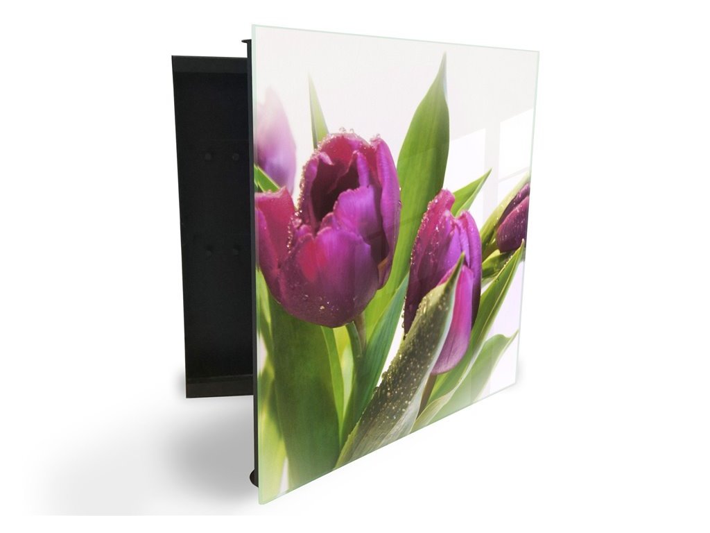 Glasdekor skříňka na klíče - květ fialový tulipán na bílém podkladu