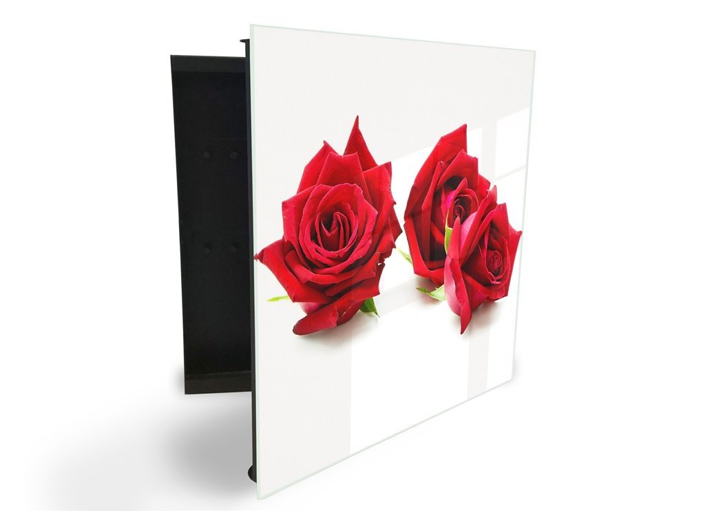 Glasdekor skříňka na klíče - květy červené růže na bílém