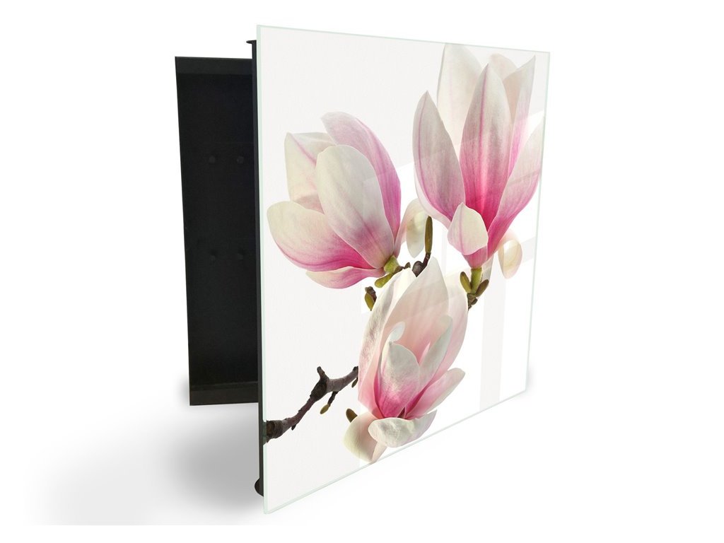Glasdekor skříňka na klíče - květy magnolie na bílém podkladu