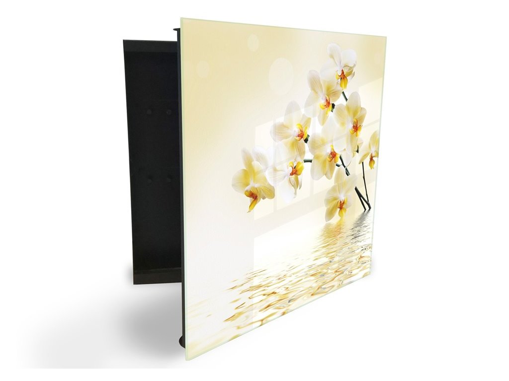 Glasdekor skříňka na klíče - květy žluté orchideje nad hladinou