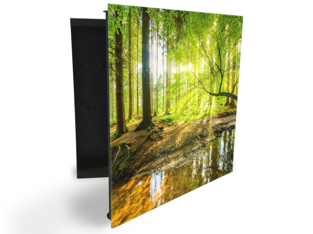 Glasdekor skříňka na klíče - les, slunce a potok