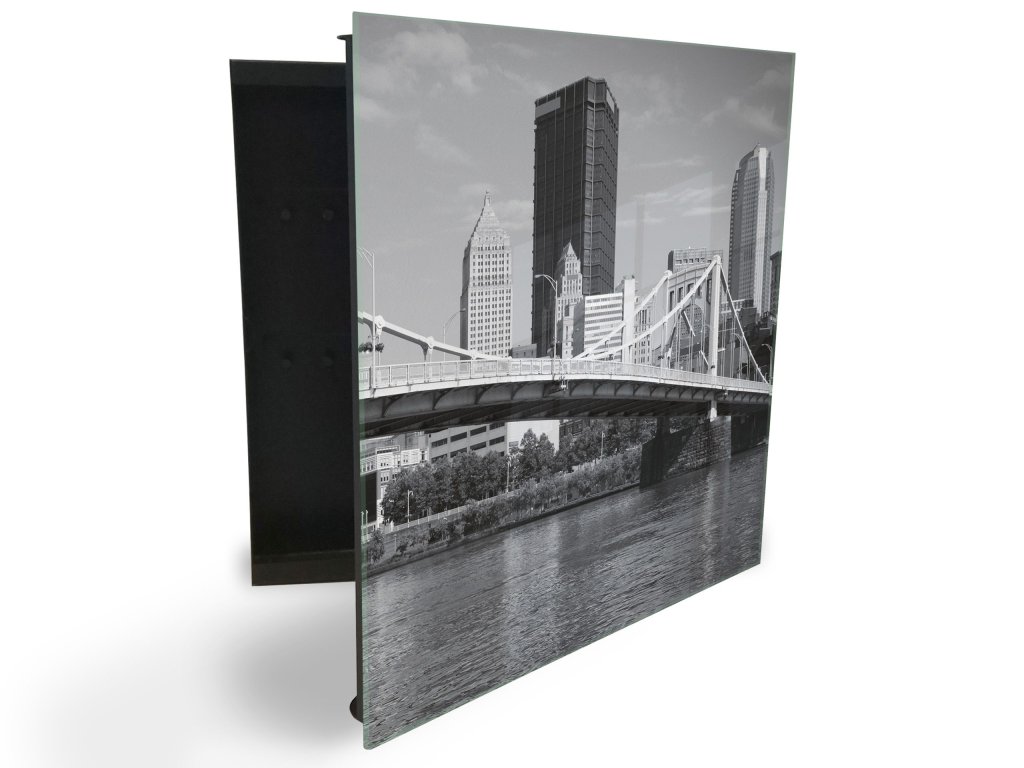Glasdekor skříňka na klíče - mrakodrap a most nad řekou