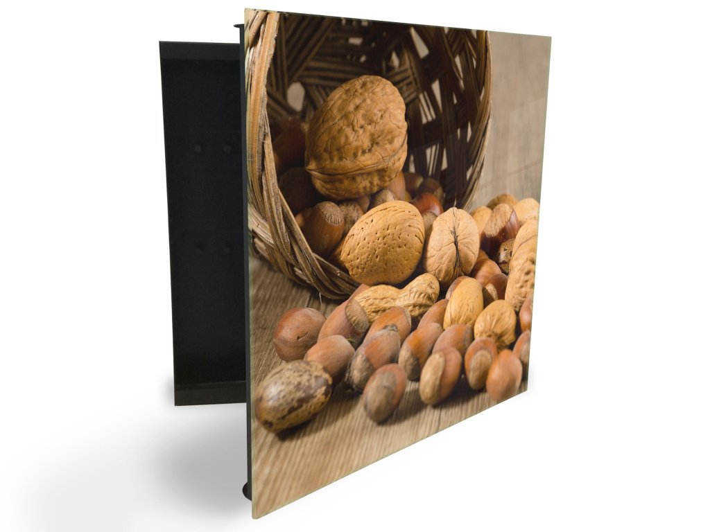 Glasdekor skříňka na klíče - ořechy, košík na dřevěném stole