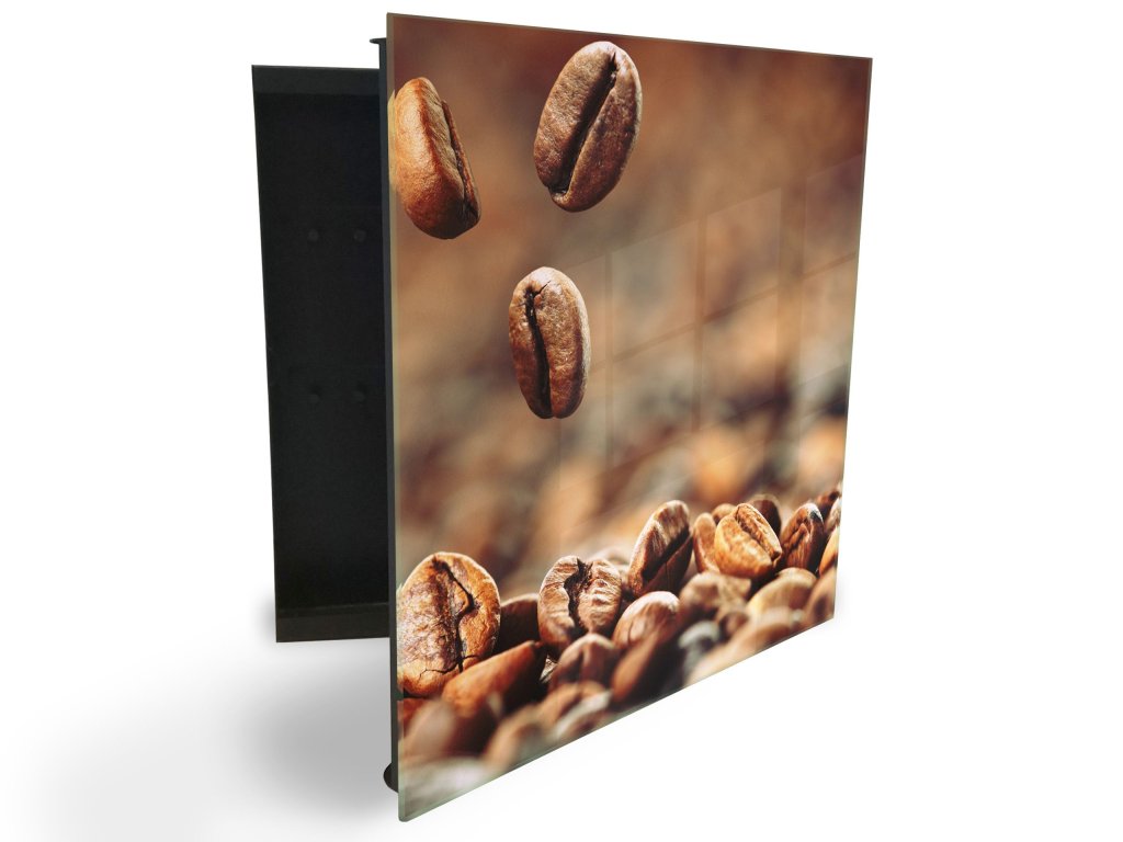Glasdekor skříňka na klíče - padající zrna kávy na hnědém podkladu