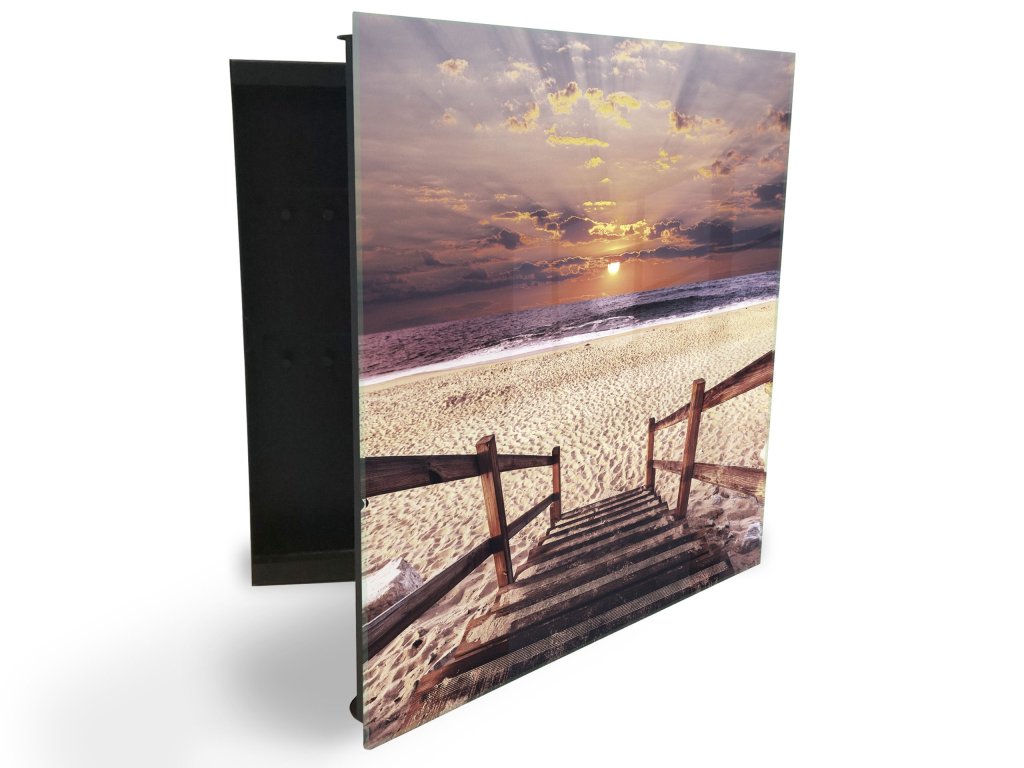 Glasdekor skříňka na klíče - promenáda na pláži západ slunce