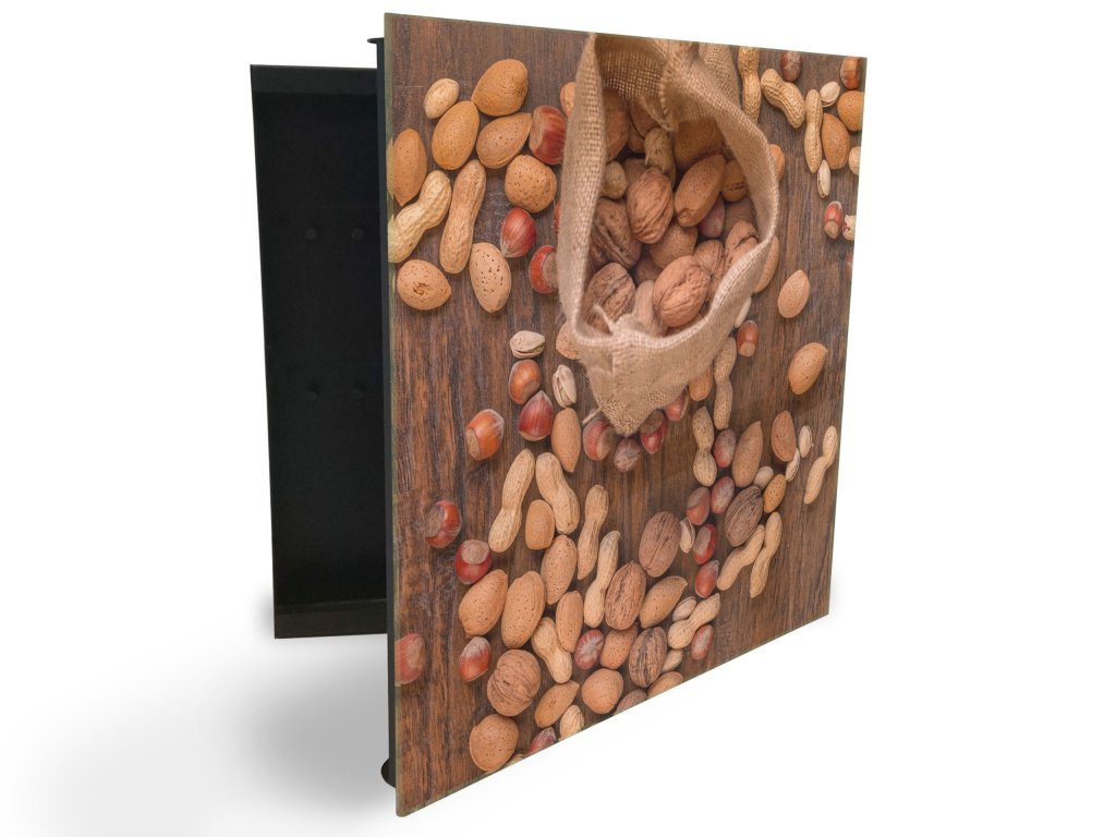 Glasdekor skříňka na klíče - rozsypané ořechy a pytlík na dřevě