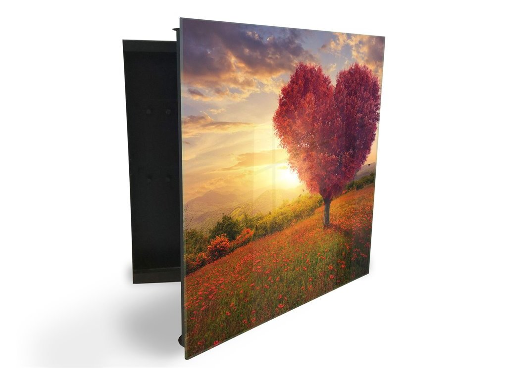 Glasdekor skříňka na klíče - růžový strom srdce a západ slunce