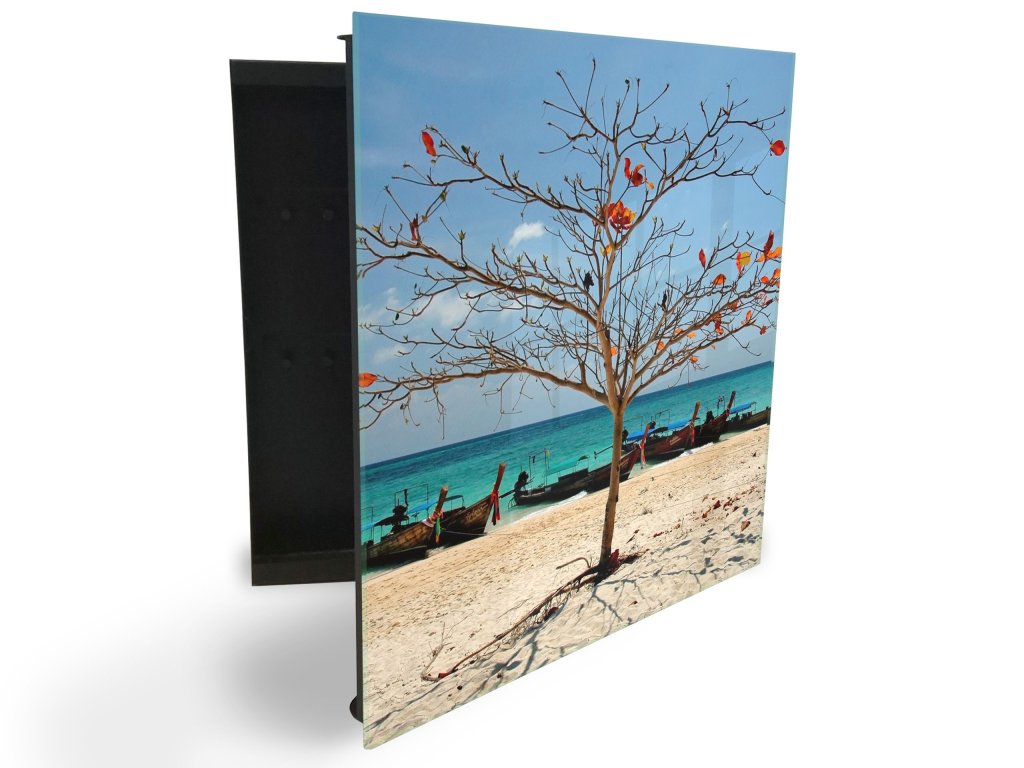 Glasdekor skříňka na klíče - strom bez listí na pláži u moře
