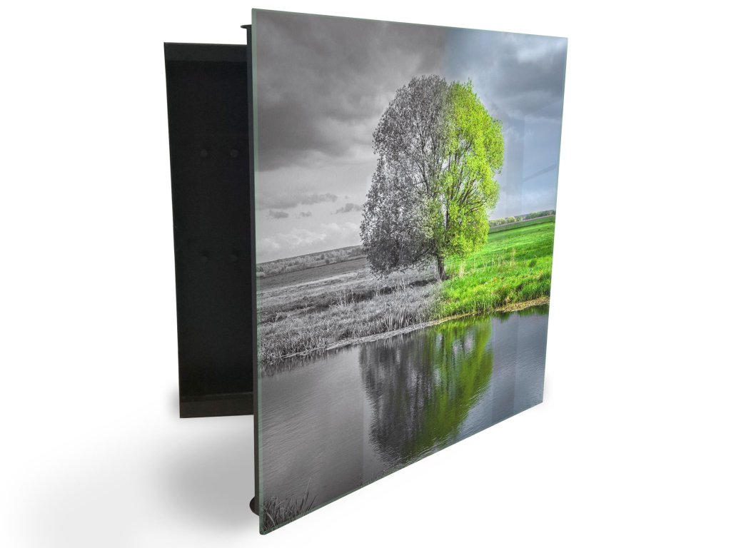 Glasdekor skříňka na klíče - strom u jezera zeleno šedý abstrakt
