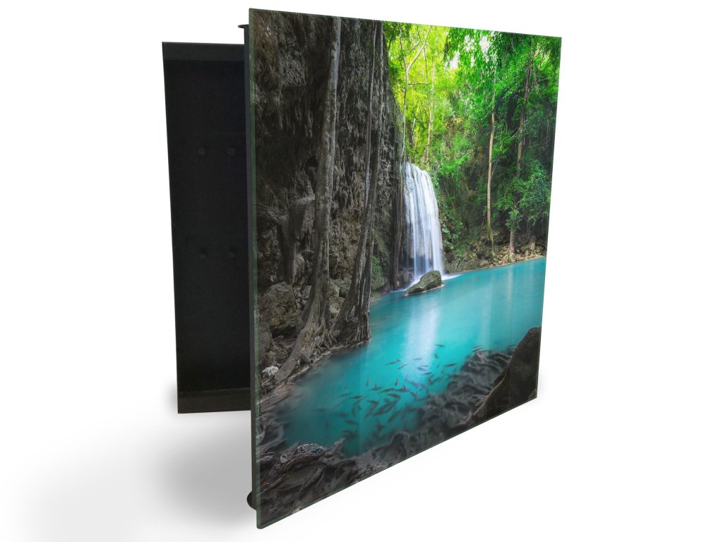 Glasdekor skříňka na klíče - tyrkysová voda a vodopád v džungli