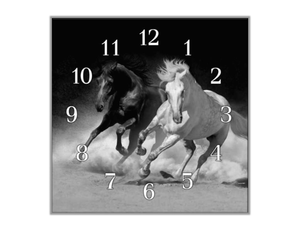 Nástěnné hodiny 30x30cm bílý a černý kůň v prachu