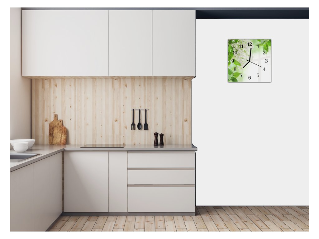 Nástěnné hodiny 30x30cm bílý šeřík a zelené listí na bílém pozadí