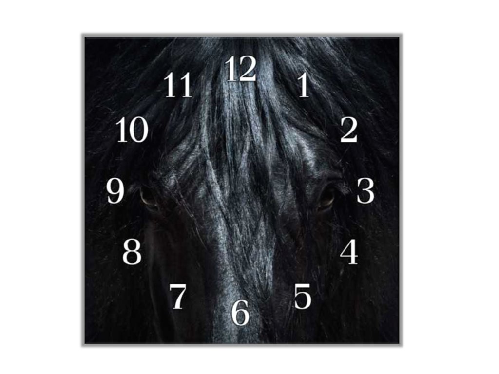 Nástěnné hodiny 30x30cm detail Fríský kůň