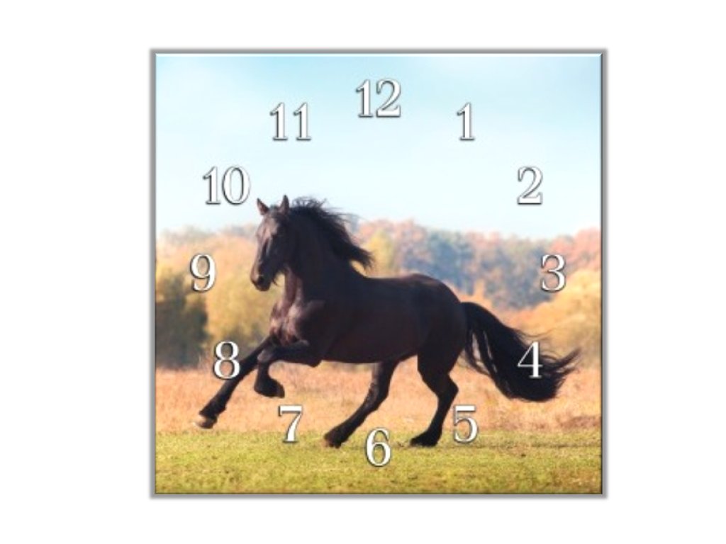 Nástěnné hodiny 30x30cm klusající Fríský kůň