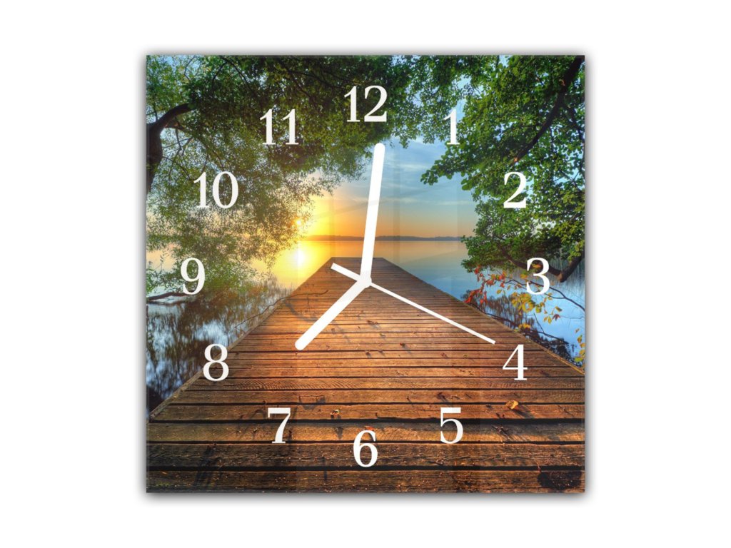 Nástěnné hodiny 30x30cm molo, západ slunce nad jezerem