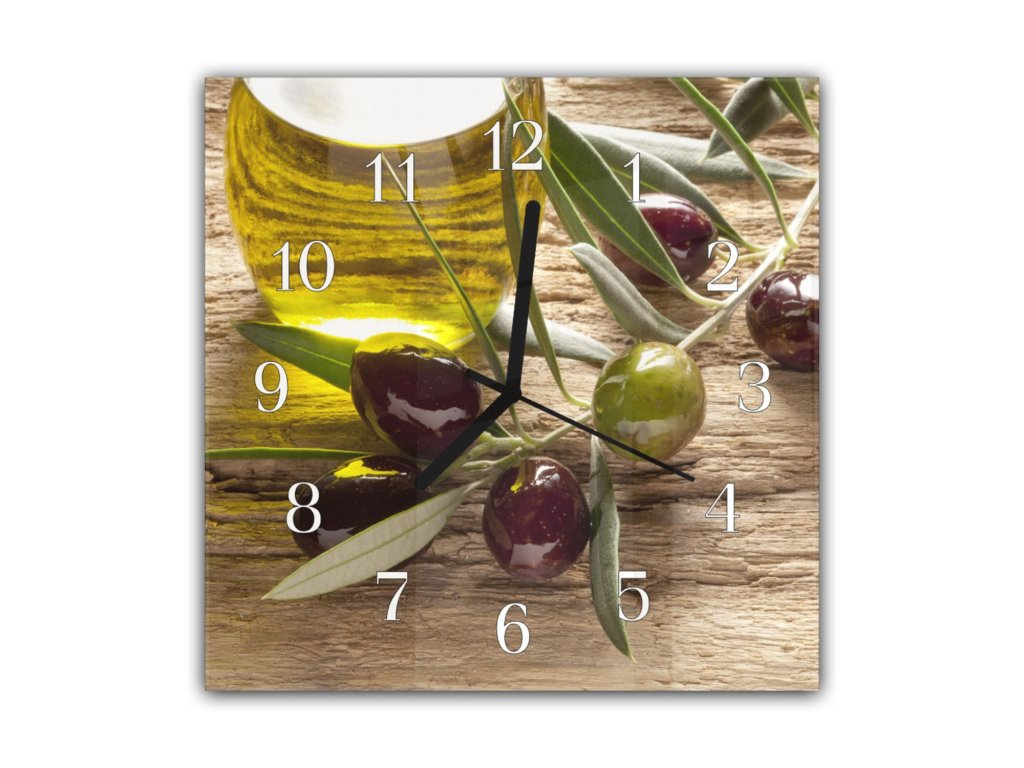 Nástěnné hodiny 30x30cm olivy na větvi a olej ve skle