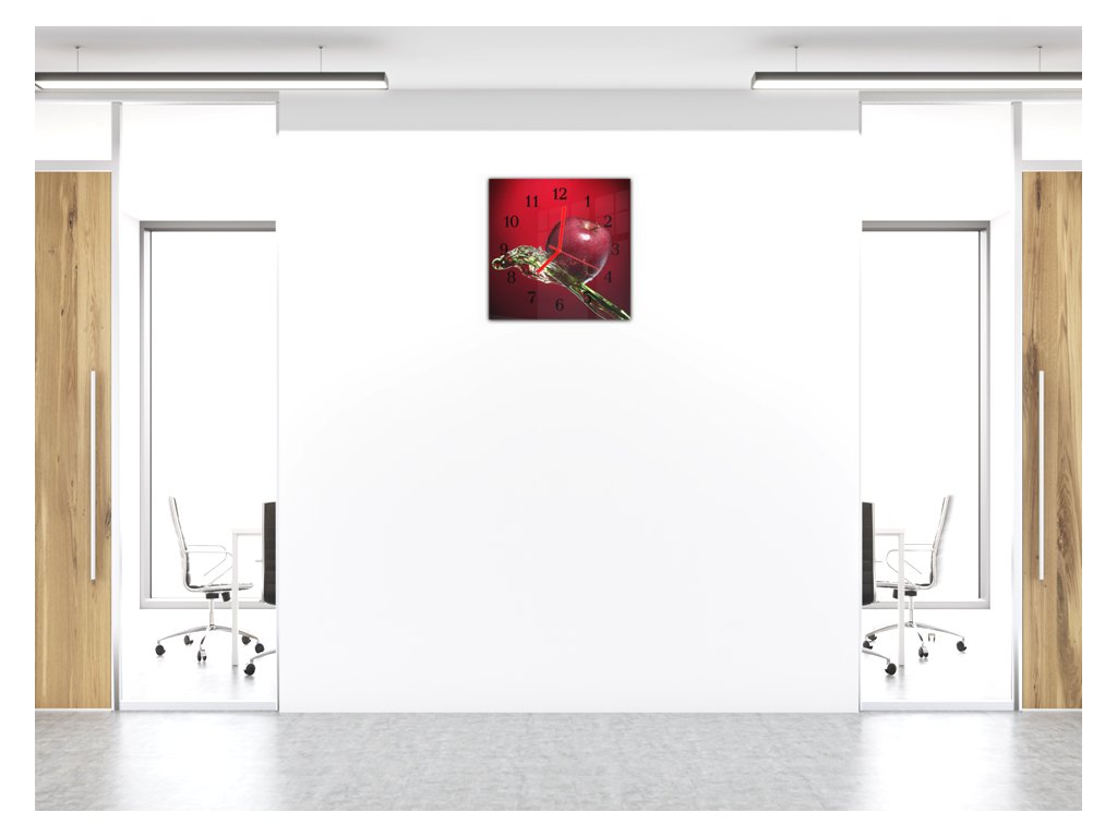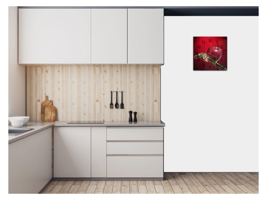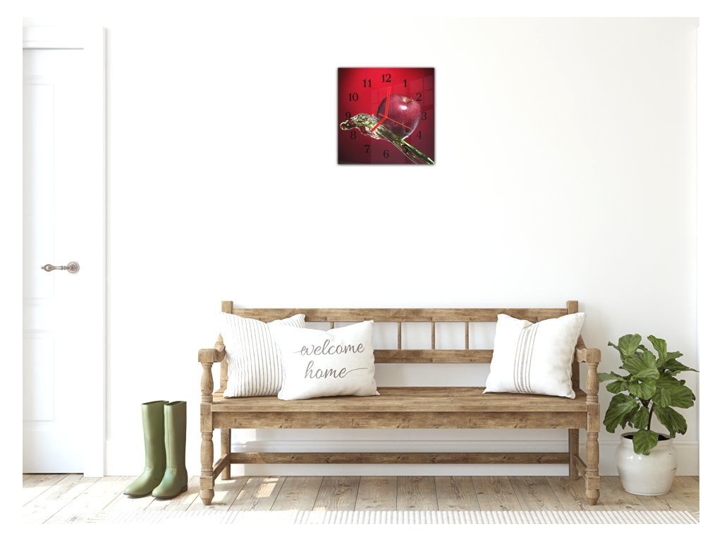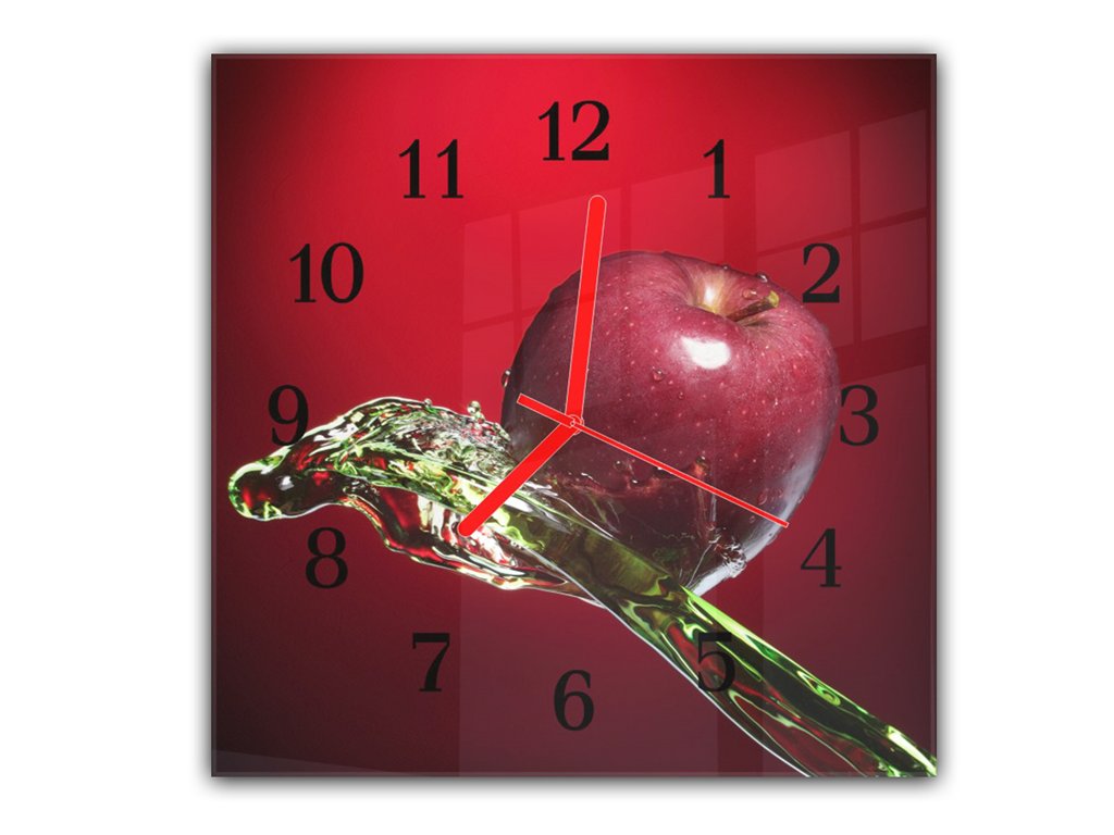 Nástěnné hodiny 30x30cm ovoce červené jablko na červeném podkladu
