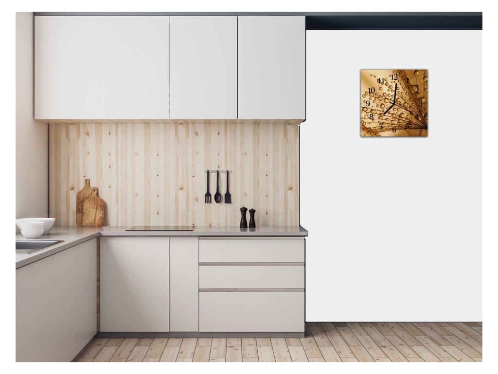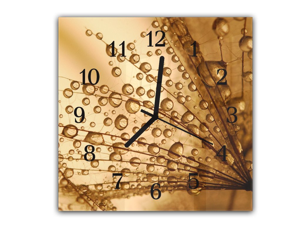 Nástěnné hodiny 30x30cm padáky pampelišky s rosou na hnědém pozadí