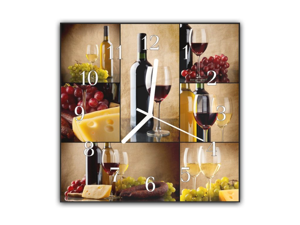 Nástěnné hodiny 30x30cm sklenice, hrozny, láhev víno