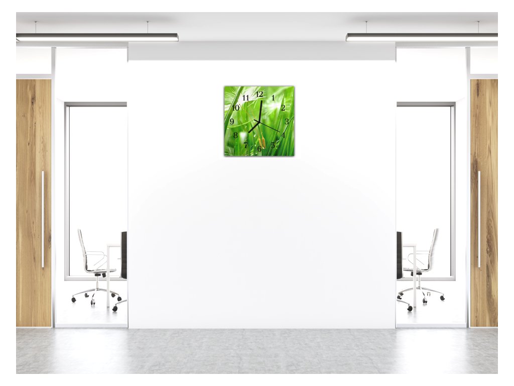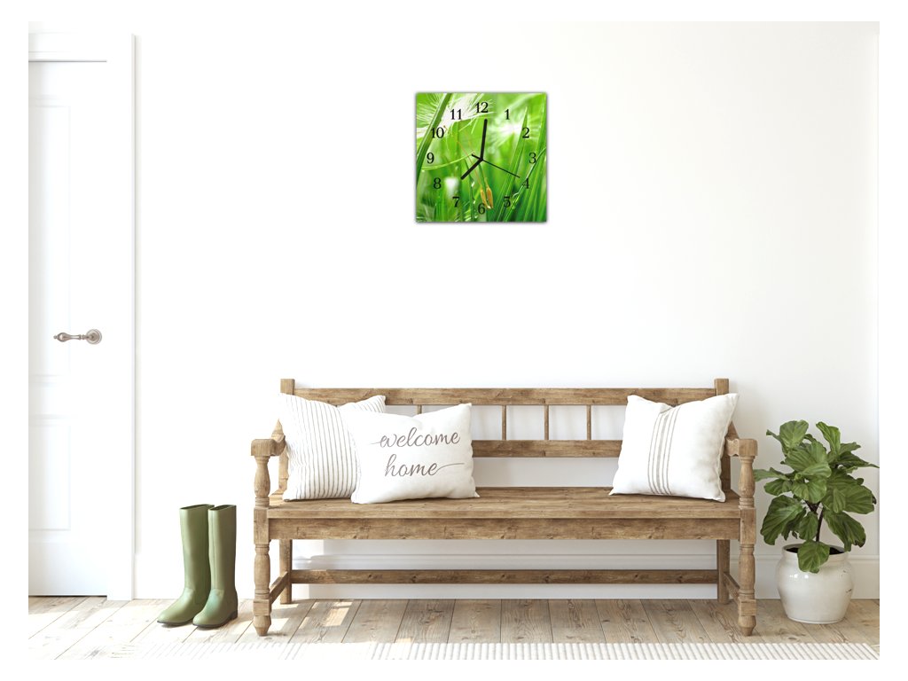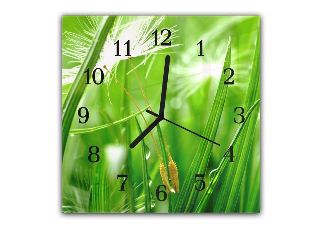 Nástěnné hodiny 30x30cm stvoly zelené trávy a chmýří odkvetlé pampelišky