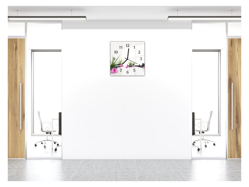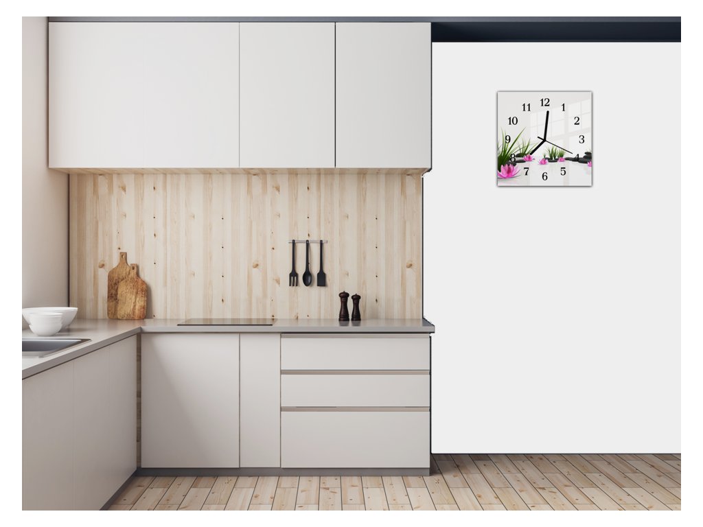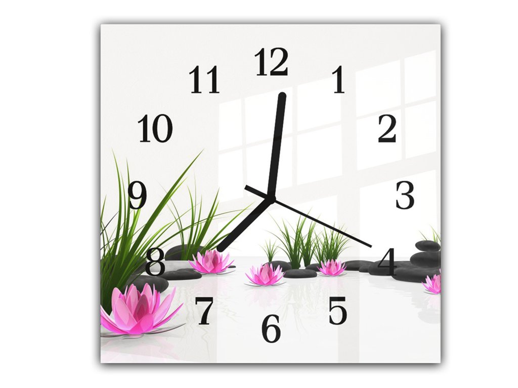 Nástěnné hodiny 30x30cm tráva, růžové květy, kameny