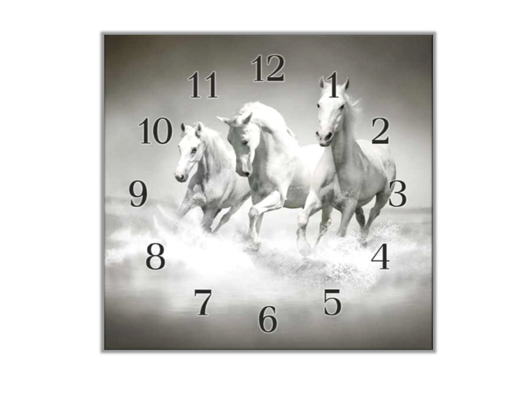 Nástěnné hodiny 30x30cm tři bílí koně v běhu