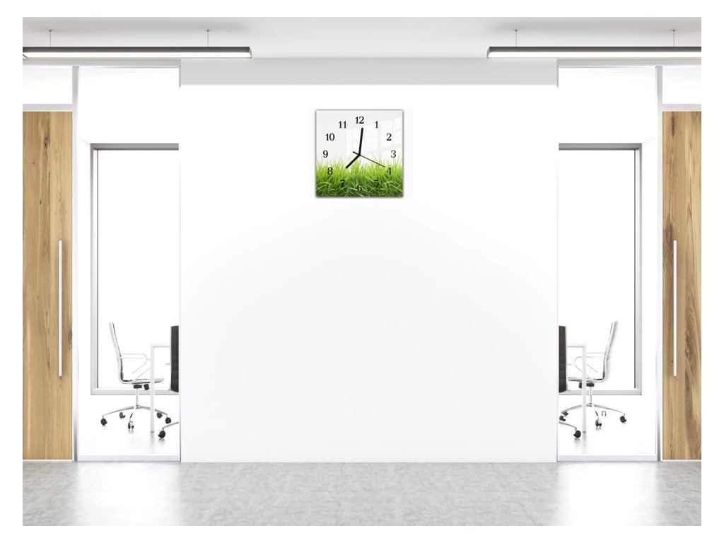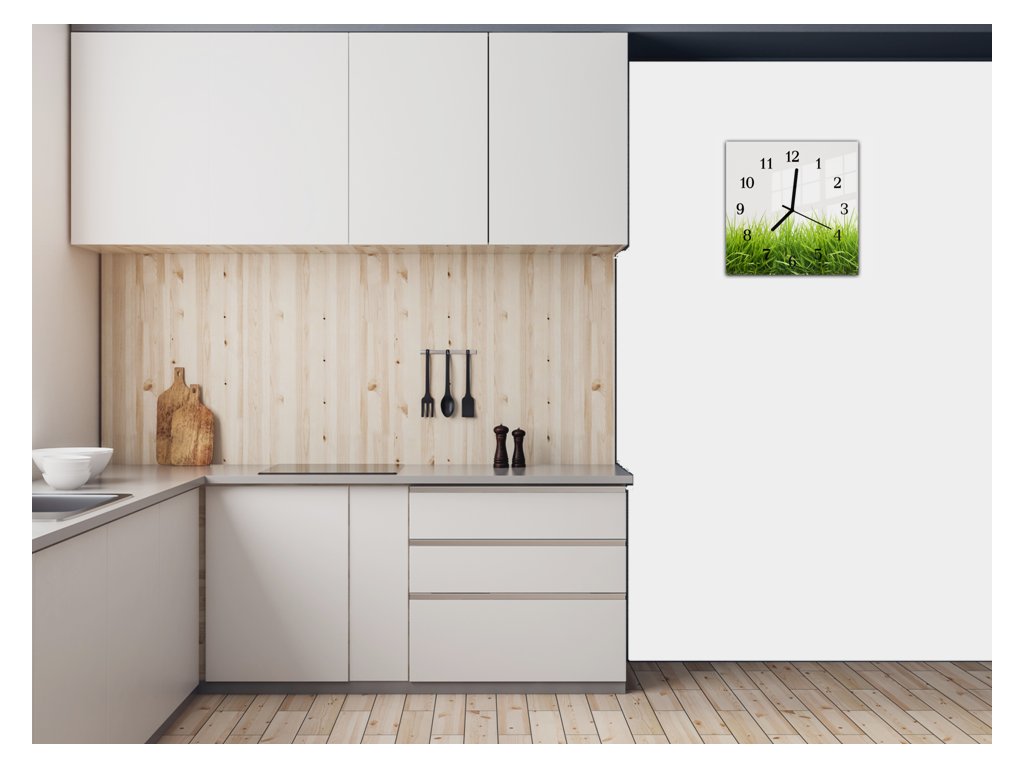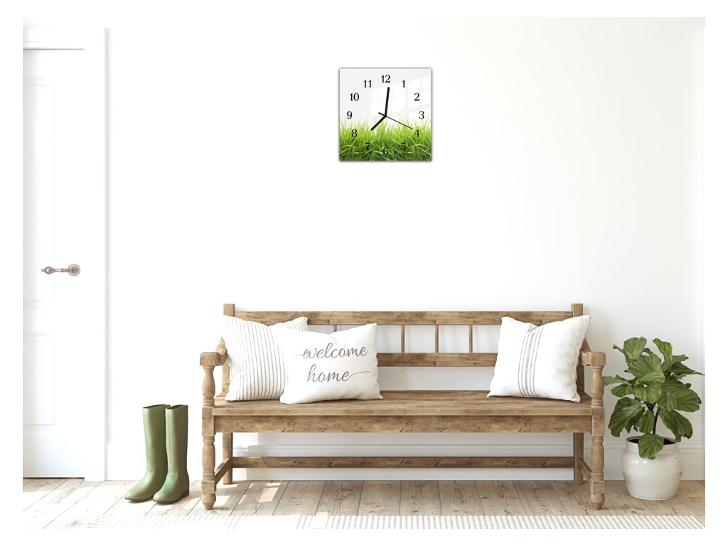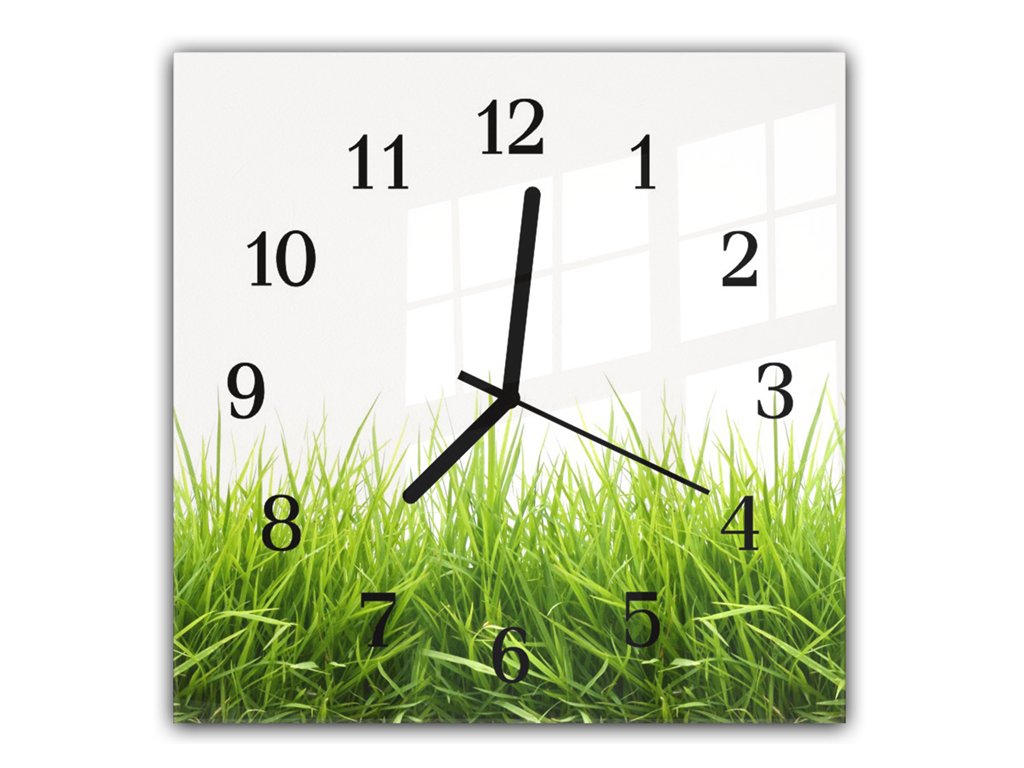 Nástěnné hodiny 30x30cm zelená jarní tráva na bílém podkladu