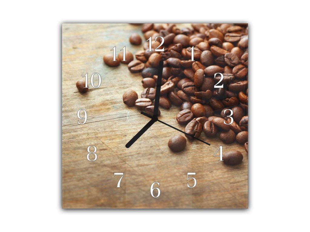 Nástěnné hodiny 30x30cm zrna kávy na dřevěném stole