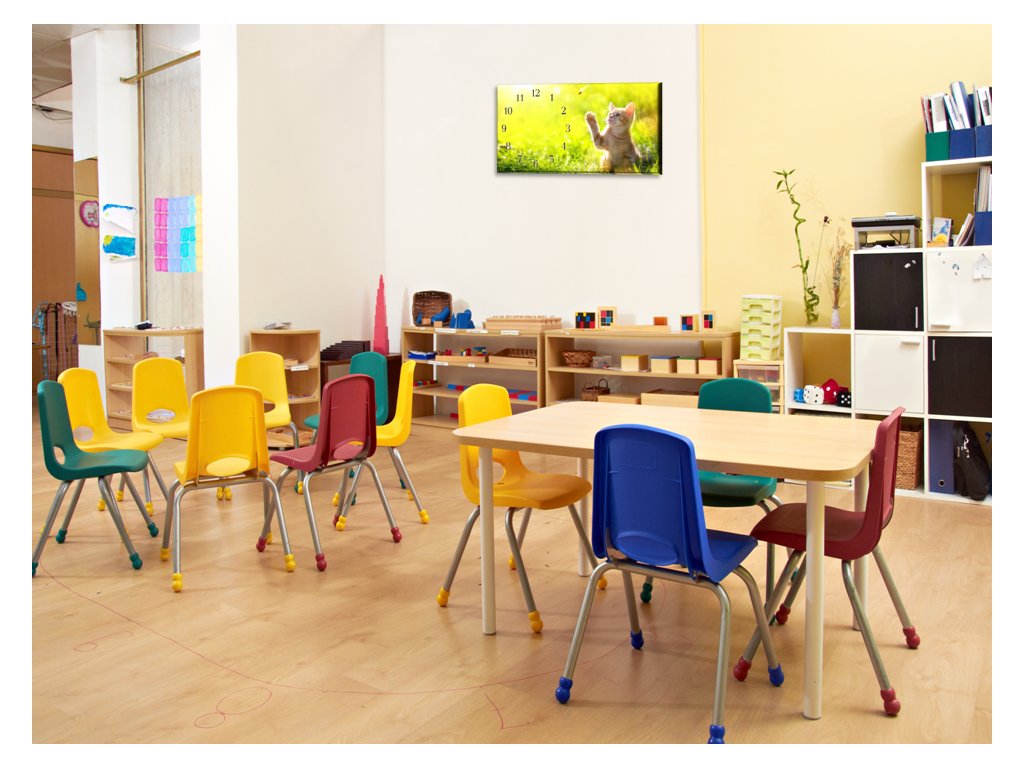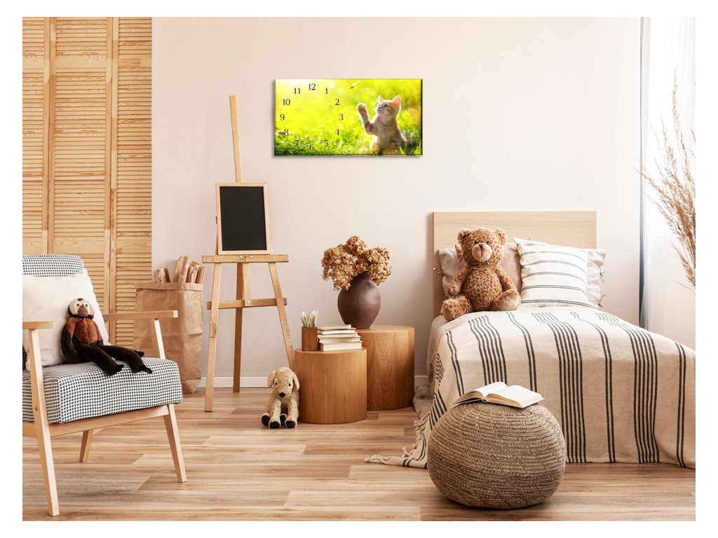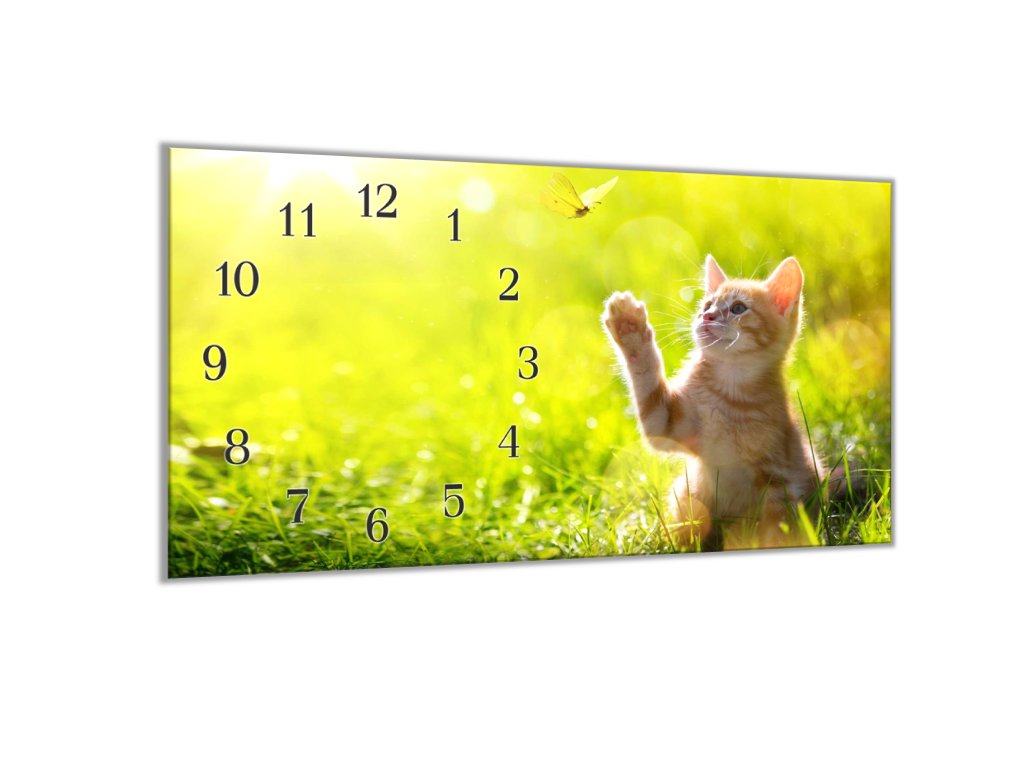 Nástěnné hodiny 30x60cm kotě v trávě a motýlem