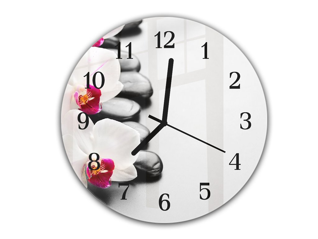 Nástěnné hodiny kulaté pr.30cm bílé květy orchideje na černých kamenech
