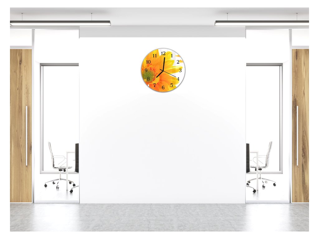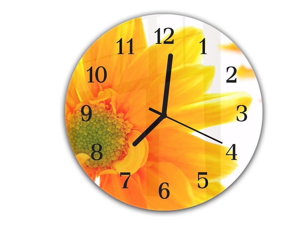Nástěnné hodiny kulaté pr.30cm detail květu sytě žluté chryzantémy