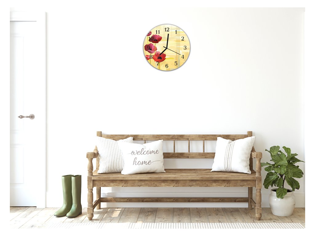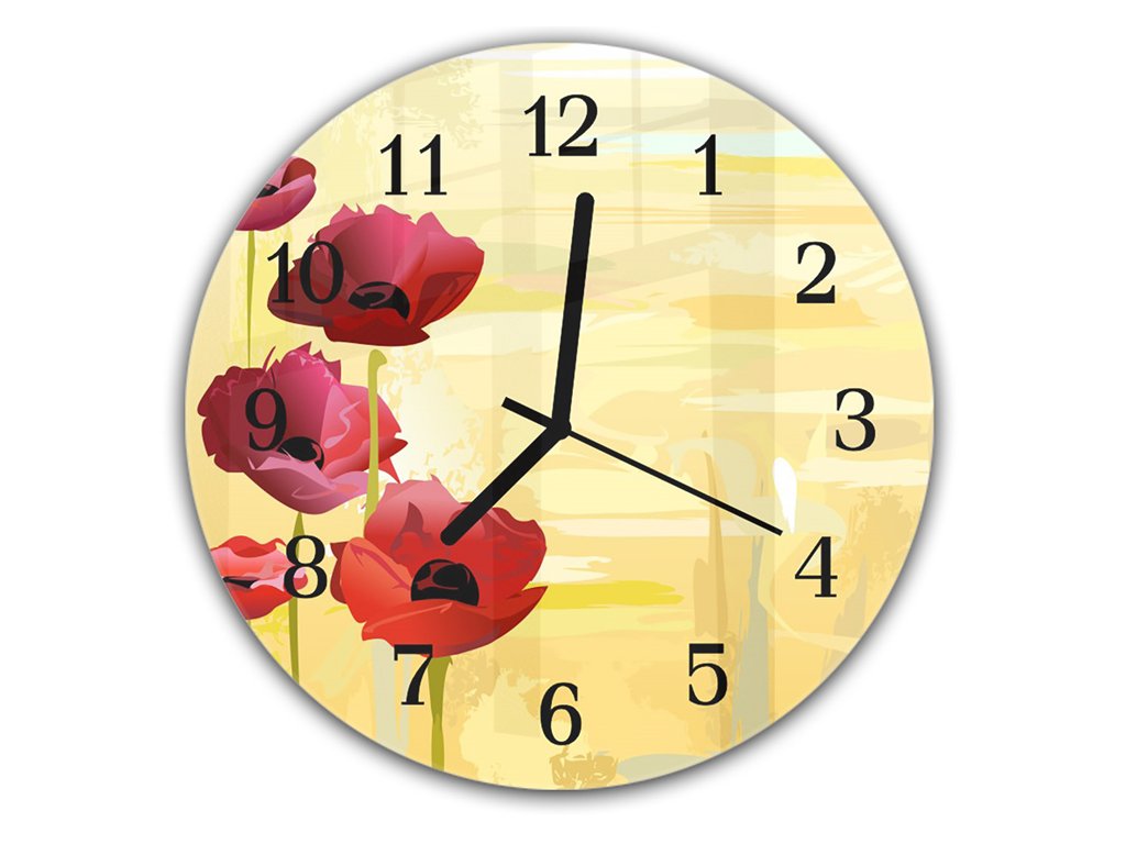 Nástěnné hodiny kulaté pr.30cm malované květy vlčí máky na žlutém podkladu