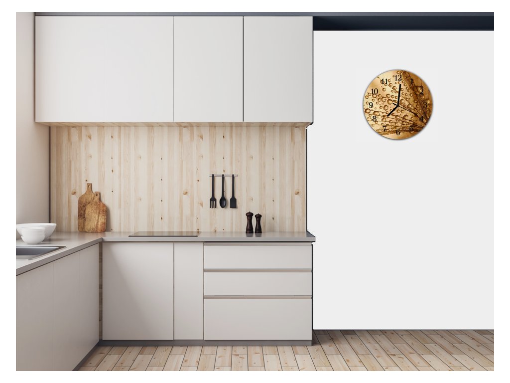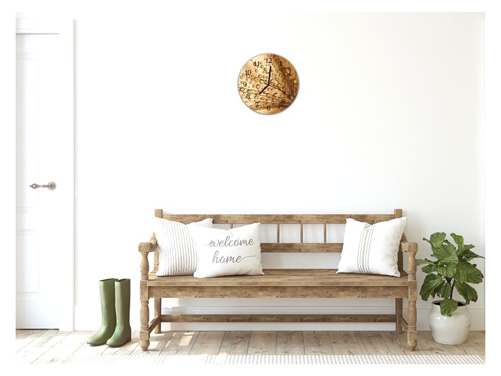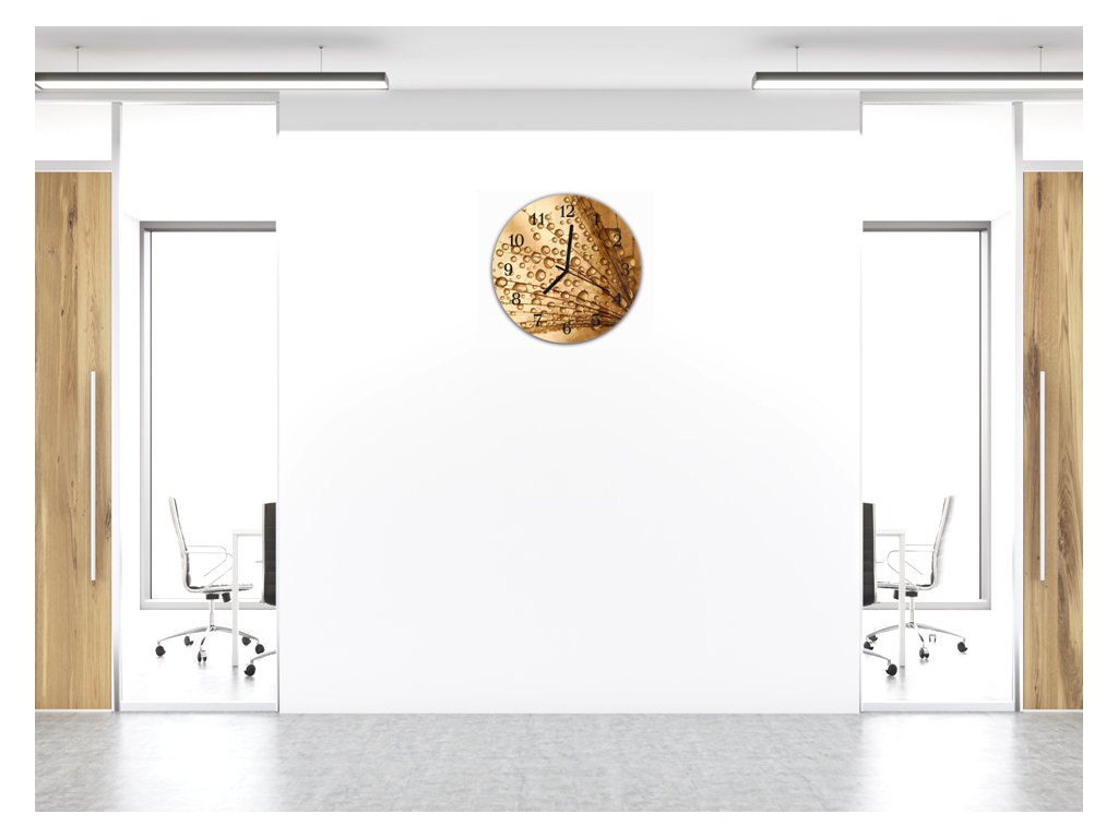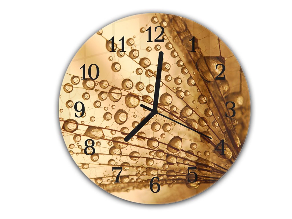 Nástěnné hodiny kulaté pr.30cm semena pampelišky s rosou na hnědém