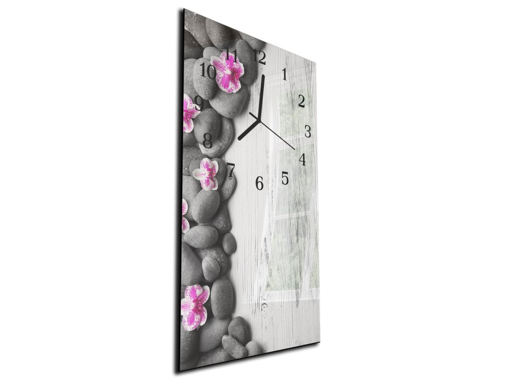 Nástěnné hodiny orchidej, kámen, bílé dřevo 30x60cm
