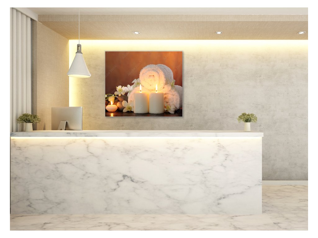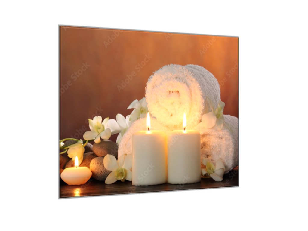 Obraz skleněný bílá svíce, ručník a květ